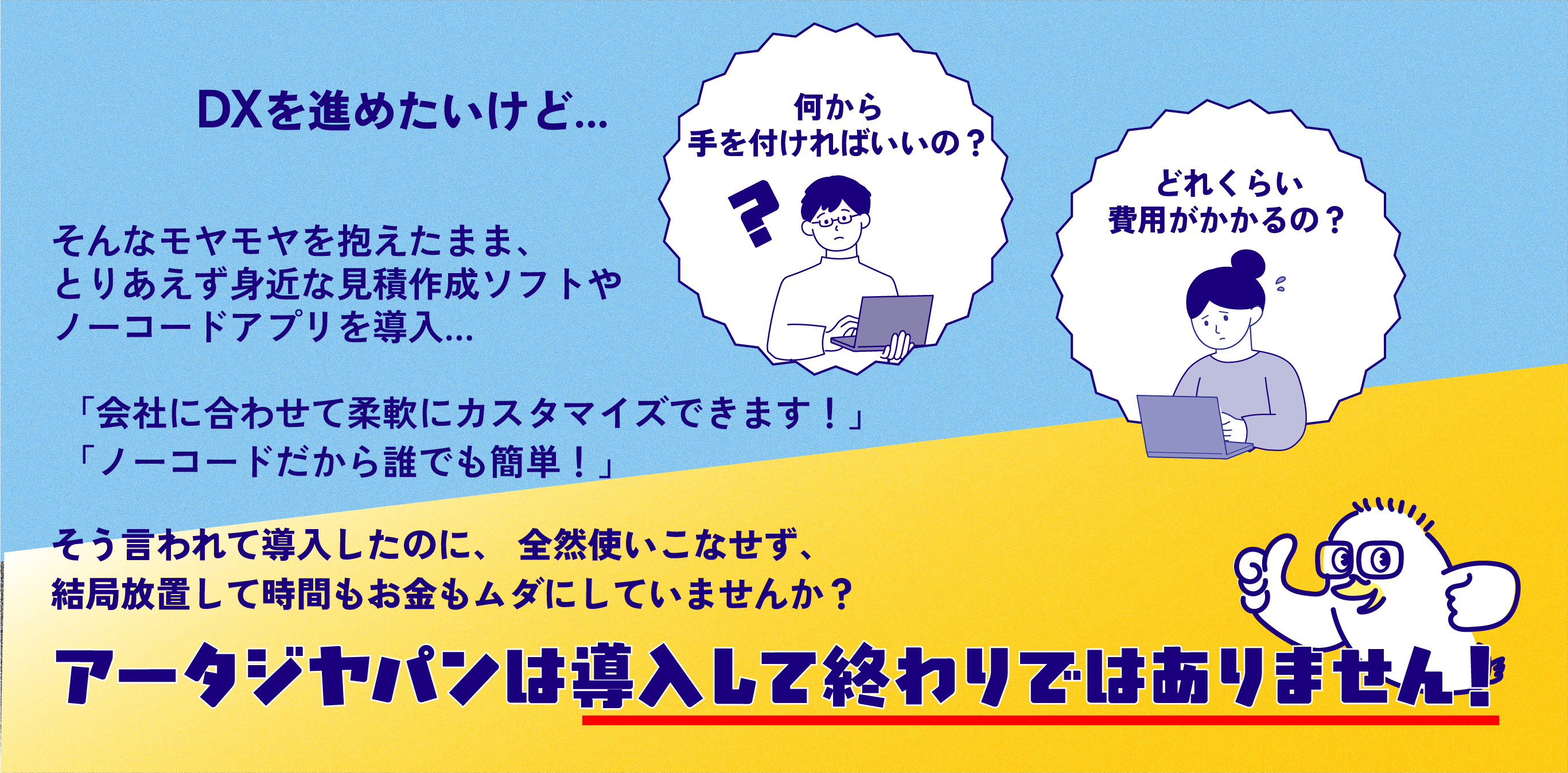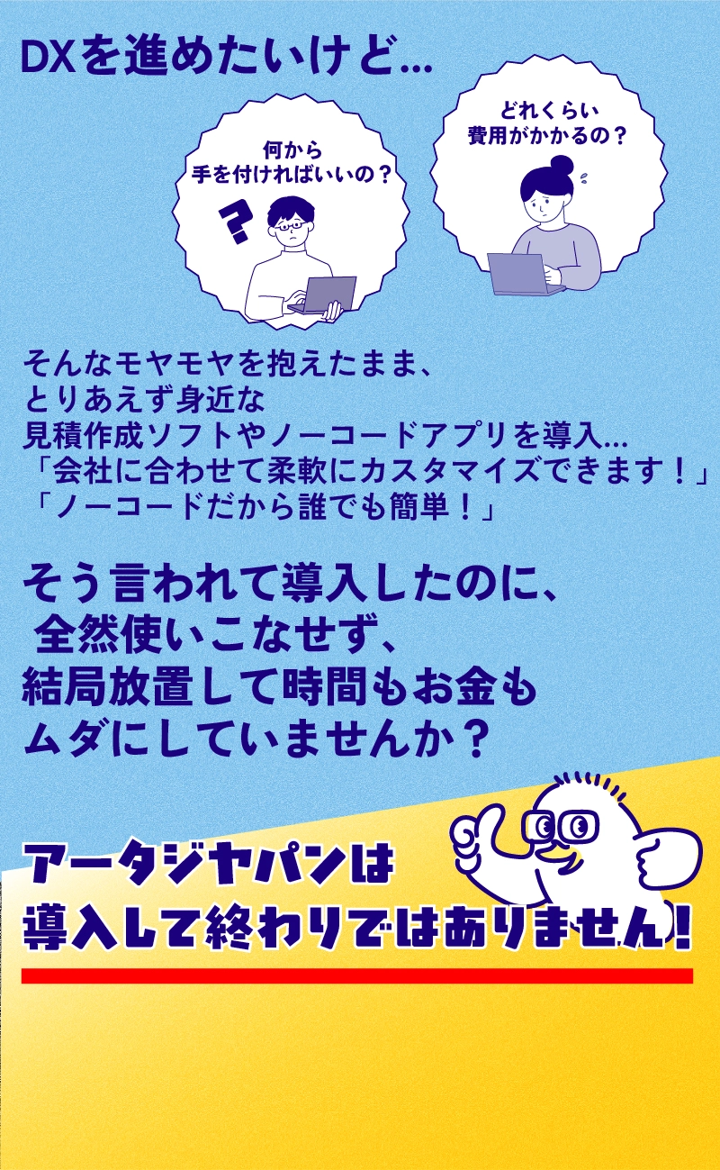 現場の業務フローを丁寧ヒアリング・分析し、現場に合う形にエンジニアがkintone・WEBアプリ・AIを用いて御社専用に最適化致します。「システムやツールを入れたのに結局使われない...」 そんなお金の無駄を回避できます。